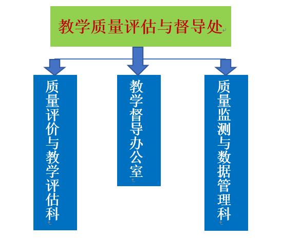 教学质量评估与督导处是在学校党委、行政和理事会领导下,行使教育教学和教学质量管理,负责对教育教学工作的质量进行监控、评估、指导的主要职能部门。教学质量评估与督导处是于2021年6月7日,由本科教学工作合格评估办公室与教学督导办公室合并而来。处内设质量评价与教学评估科、质量监测与数据管理科、教学督导办公室,现有工作人员5人,其中硕士3人、学士2人,高级职称2人、中级职称3人。